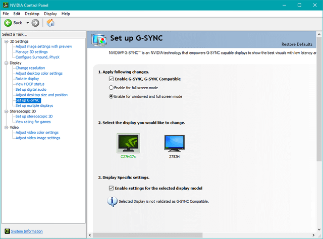 - Verify the box to enable G-Sync is checked